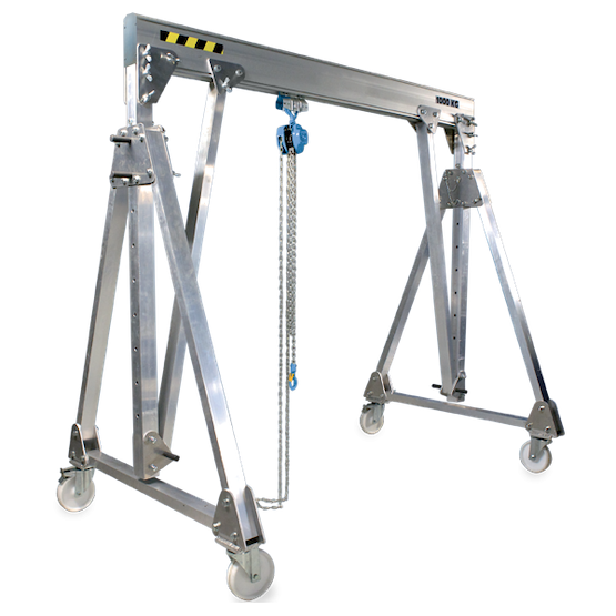 Ce portique d'atelier aluminium est disponible avec une porté maximale de 6,5 m et une hauteur sous fer réglable sur 3 niveaux. Il est déplaçable en charge, grâce à 4 roues pivotantes (dont 2 roues avec blocage). Grâce à sa poutre de roulement en rail creux, ce produit bénéficie d'un confort d'utilisation optimal, permettant de répondre à des demandes ponctuelles ou intensives.